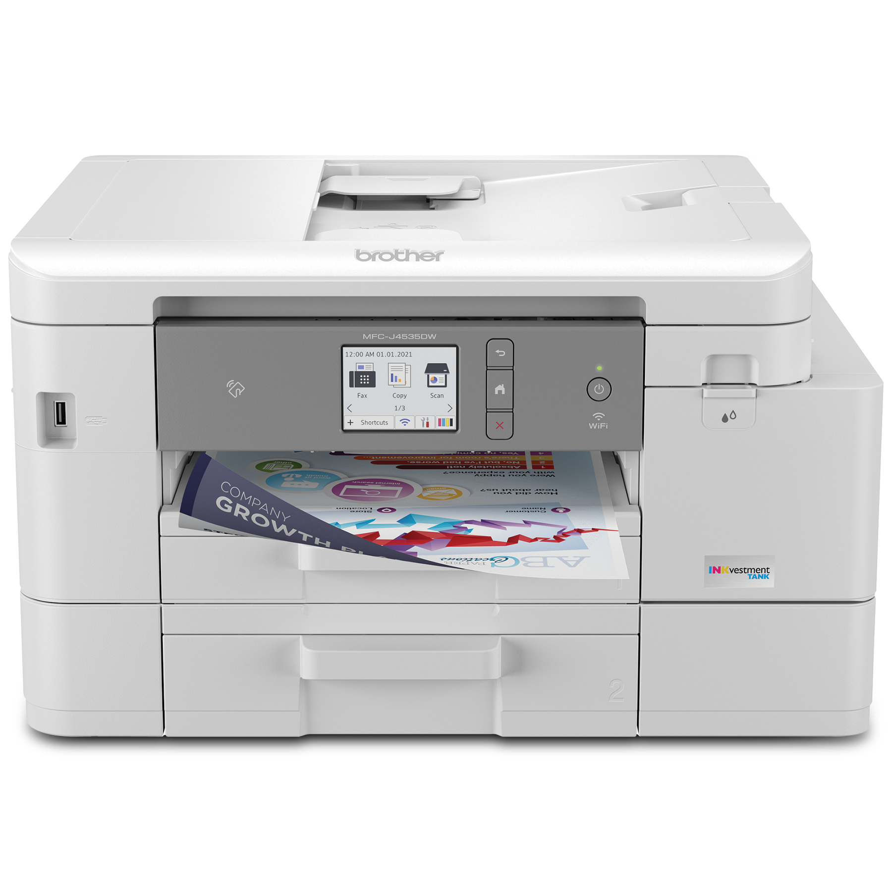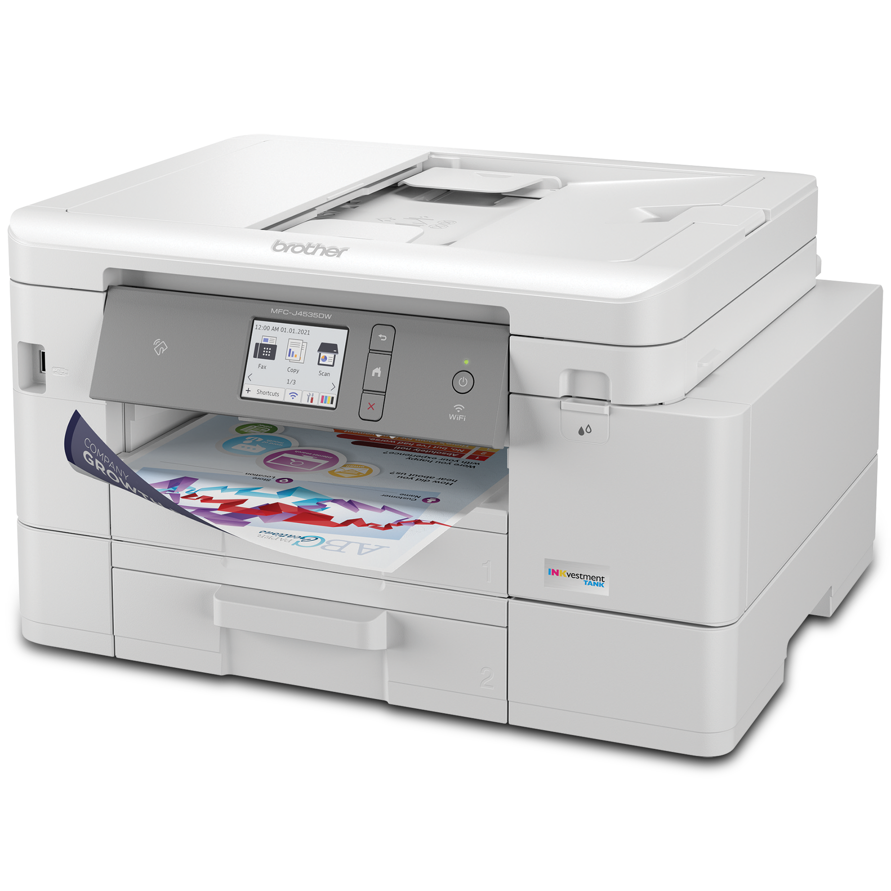 The Brother MFC-J4535DW INKvestment Tank all-in-one colour inkjet printer is an ideal choice for home and small office use. It features reengineered high-capacity ink cartridges that provide up to 1 year of uninterrupted printing of approximately 150 pages per month, using only the cartridges provided in-box.